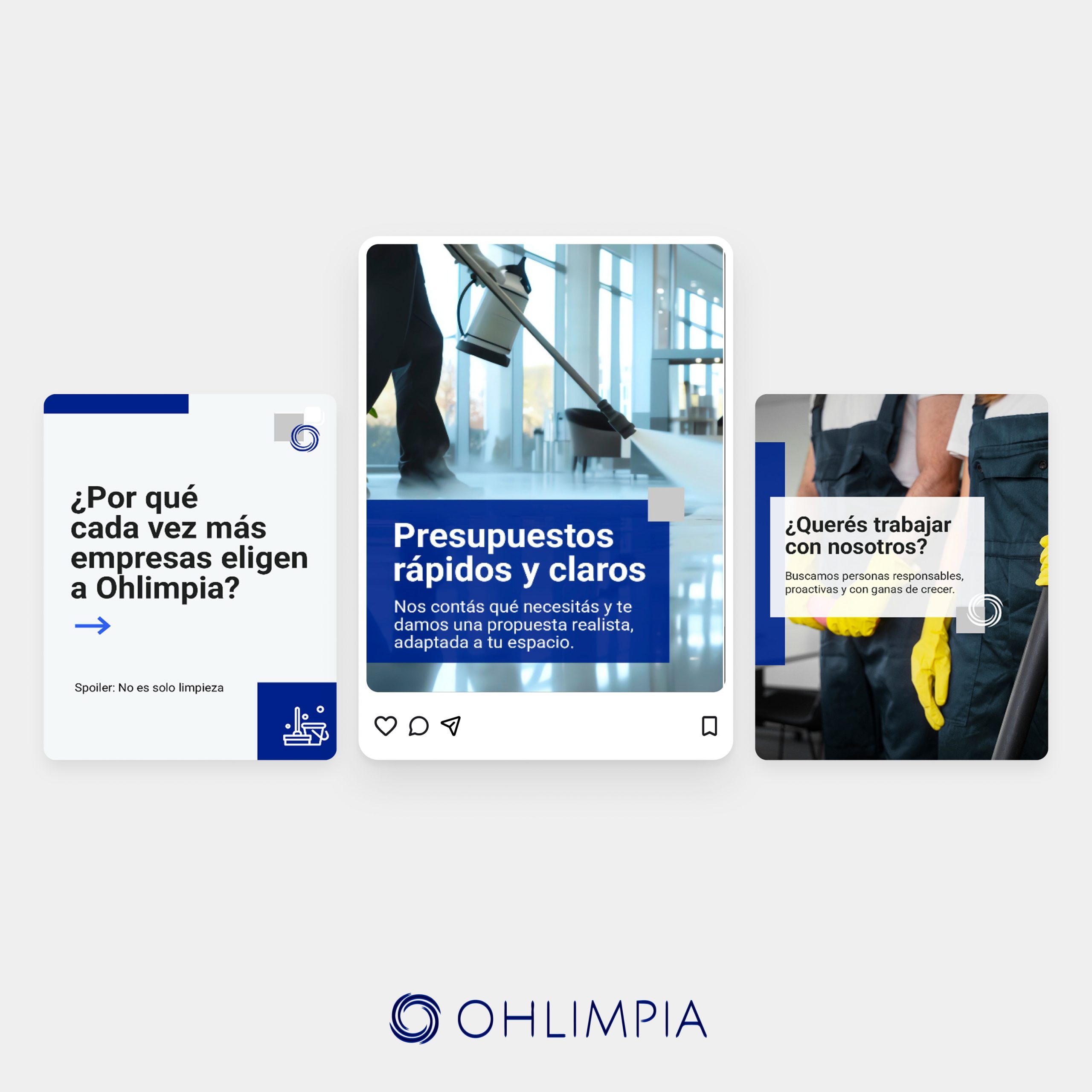 A su vez, se desarrolló una estrategia de comunicación para redes sociales orientada a reforzar el posicionamiento de Ohlimpia como proveedor profesional de servicios de limpieza para empresas, mejorando la coherencia visual y el tono institucional de la marca.
